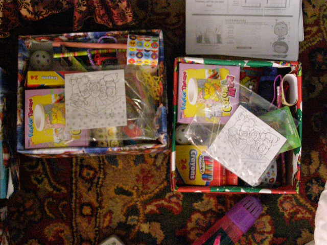 So here they are…some of the 31 shoeboxes full of goodies for “kids who don’t have anything,” as Rebekah would say. Thanks to mom, Abby, Jo Horton, Erin Sharp, Judy Strong, Shannon Morean, Anna Maria Olson, Kelly Launt, Heidi Craven, Sonia Boufford, Kelly and my kids for all their help and donations of gifts and time.