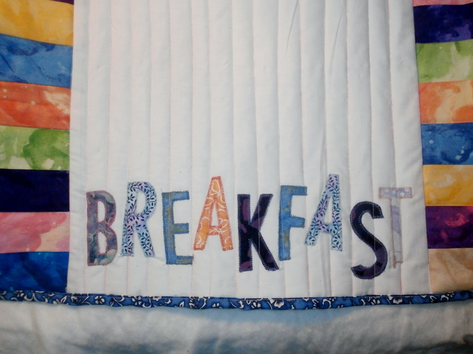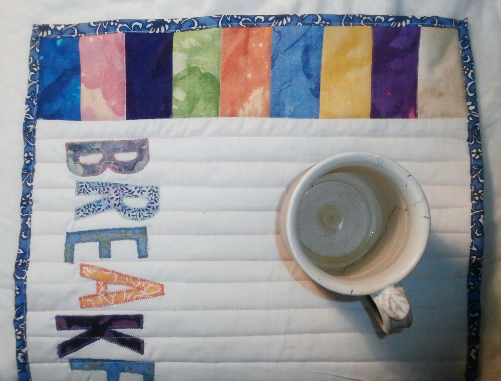 What have I finished so far?  Let’s start with these fun place mats inspired by Maureen Hensel Cracknell at Maureen Cracknell Handmade.  She is an AMAZING quilter who happens to be my mom’s best friend’s brother’s daughter.  Seriously!  I know that sounds made up but it’s TOTALLY true.  My mom grew up in a town in western PA of about 450 people.  Her neighbor was her best friend.  They both ended up in Rochester (Mom because of Dad, and her friend because of our great hospitals) so they are still best friends.  Anyhow, Maureen made these dish towels (click link above) as part of a sew along based on The book Patchwork Please! by Ayumi Takahashi!  I have too many dish towels so I decided to make place mats instead.