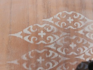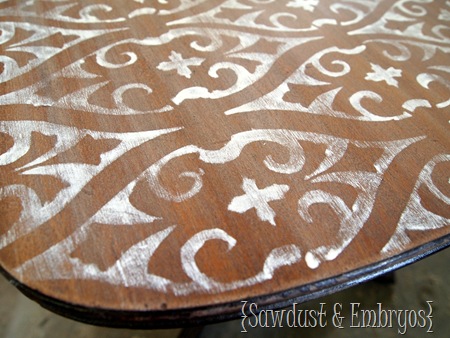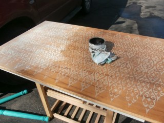 I sanded the tabletop lightly just to take the finish off. I then found the middle and began stenciling with a mix of Annie Sloan’s Old White and French Linen Chalk Paints.