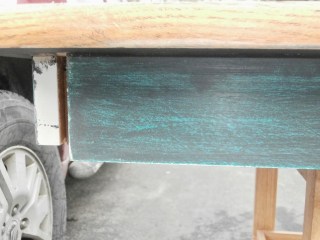 I painted the skirt and legs with Florence Chalk Paint then Graphite. (notice they match Rebekah’s legs) I sanded through the Graphite showing the Florence. Then clear waxed those parts. Now I just need to but screws for the legs!