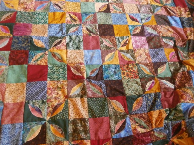 More than once Kelly had mentioned a quilt that an old friend of his had done in jewel tones that he had really liked. I knew this was going to be his quilt right then. I had all the pieces cut out already. I even had the edges of the leaves turned under. All I had to do was sew. And sew I did. It came together in one day. ONE DAY!
