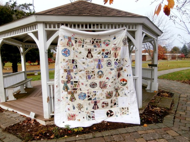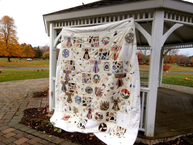 I have shown you a few pictures of this quilt over time. I started this probably 10-15 years ago. I started with the Japanese family symbol blocks. These are all done by machine applique with clear thread. I did these on one of my many visits to Grandma’s house.