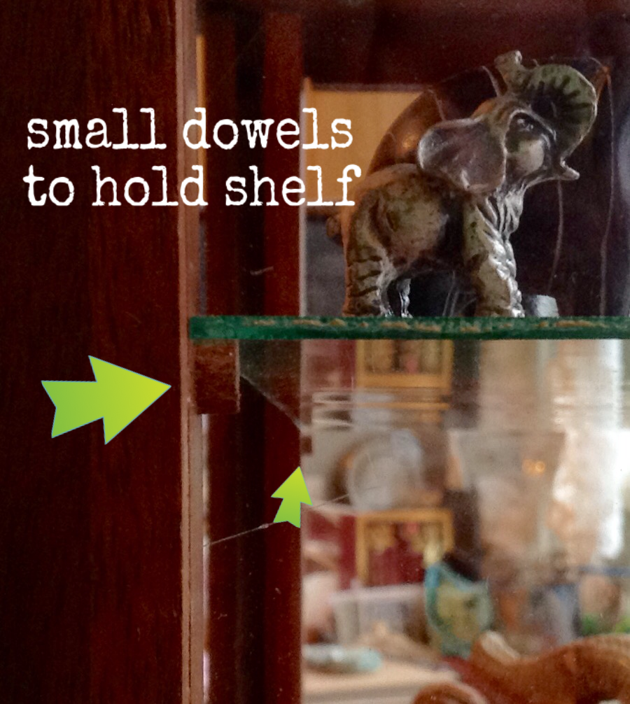 The shelf: wood or glass? Although wood would match the frame of the case, we chose to make the shelf glass to allow the light to play around with the elephants. We decided to make it just above half way to accommodate a few larger pieces on the bottom. After drilling 4 small holes in the frame & inserting 4 short pieces of stained dowel, we had a piece of glass cut to fit, & voilà, a shelf.