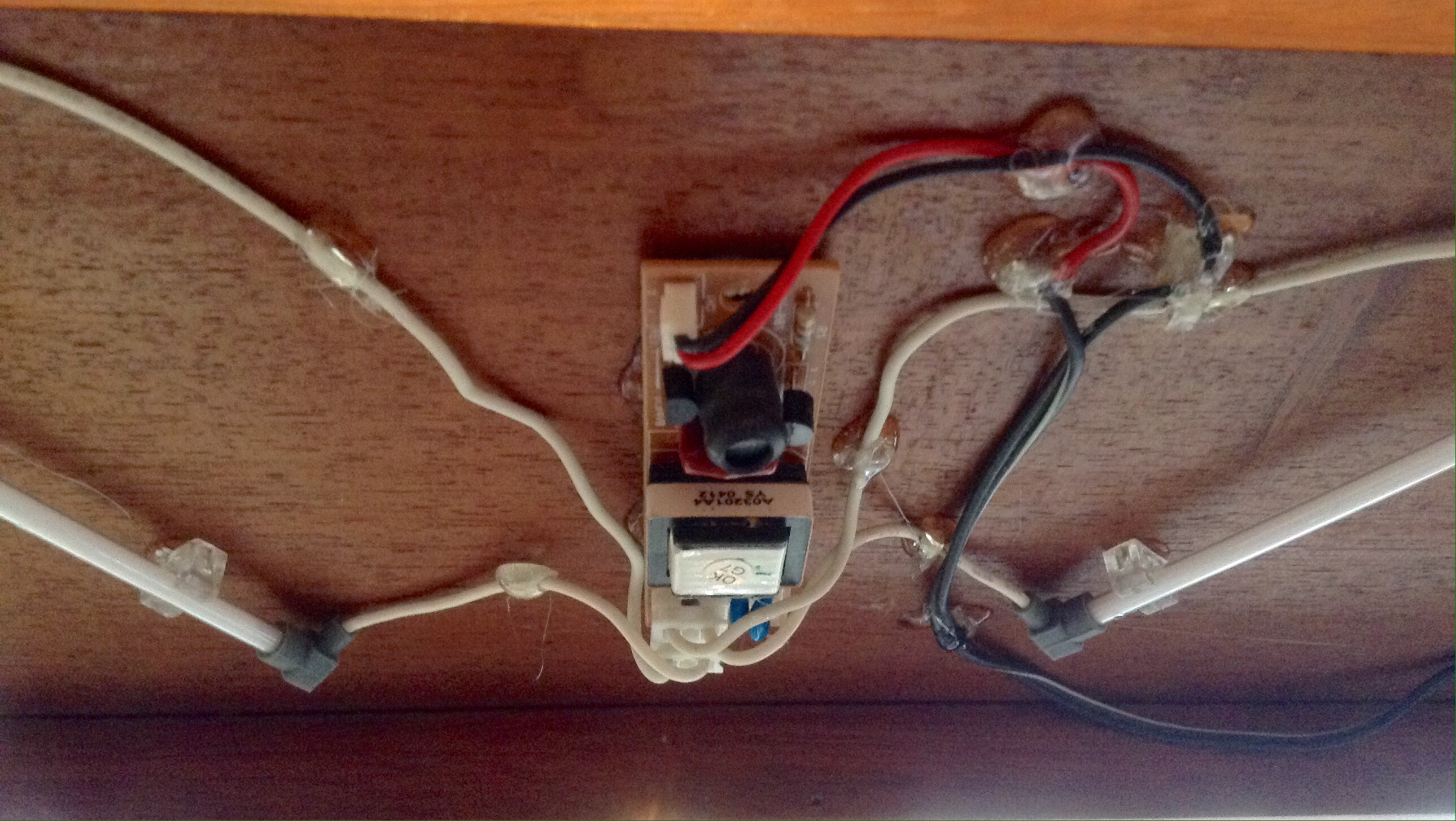He attached the lighting to the inside top of the case & ran the wires down the rear leg so that it can be plugged in with a standard adapter.
