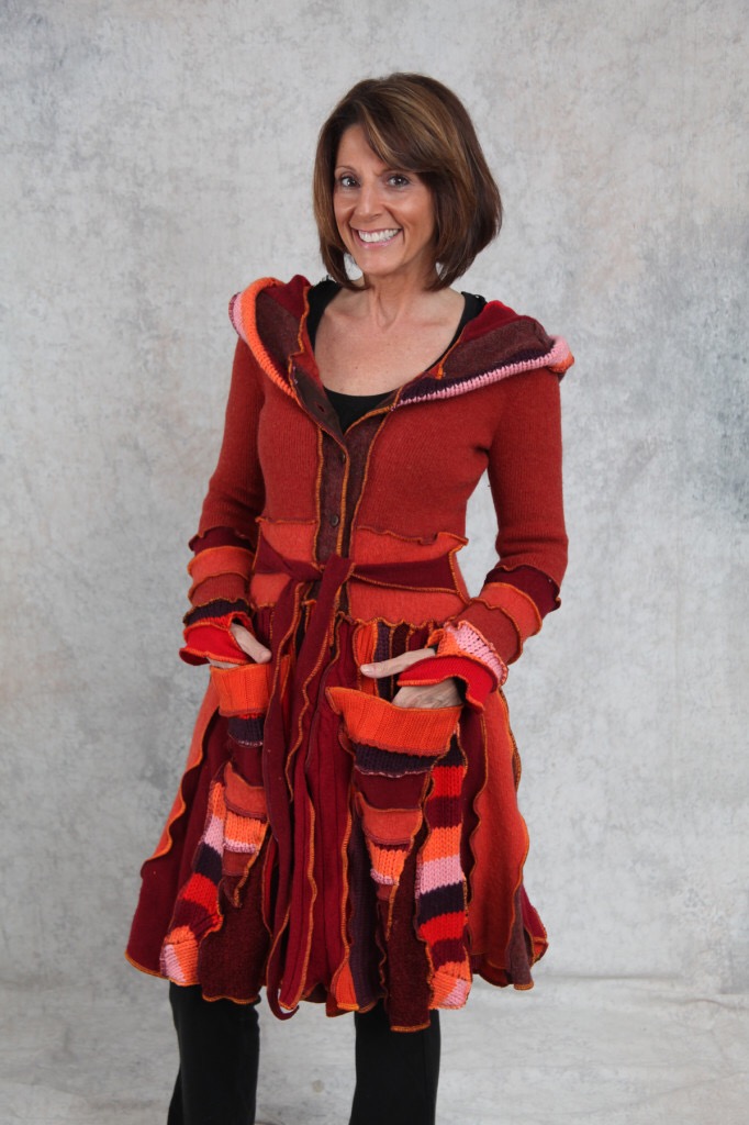 Karen Ferner at Kreationality has been creating clothes & accessories from second-hand sweaters for at least 4 years. She is able to turn those unappealing, ill-fitting sweaters into wearable works of art including skirts, ponchos, dresses, hoodies, scarves, gloves, & more. This is not an easy project; trust me, I’ve tried it. Take a look at Karen’s website for her work HERE