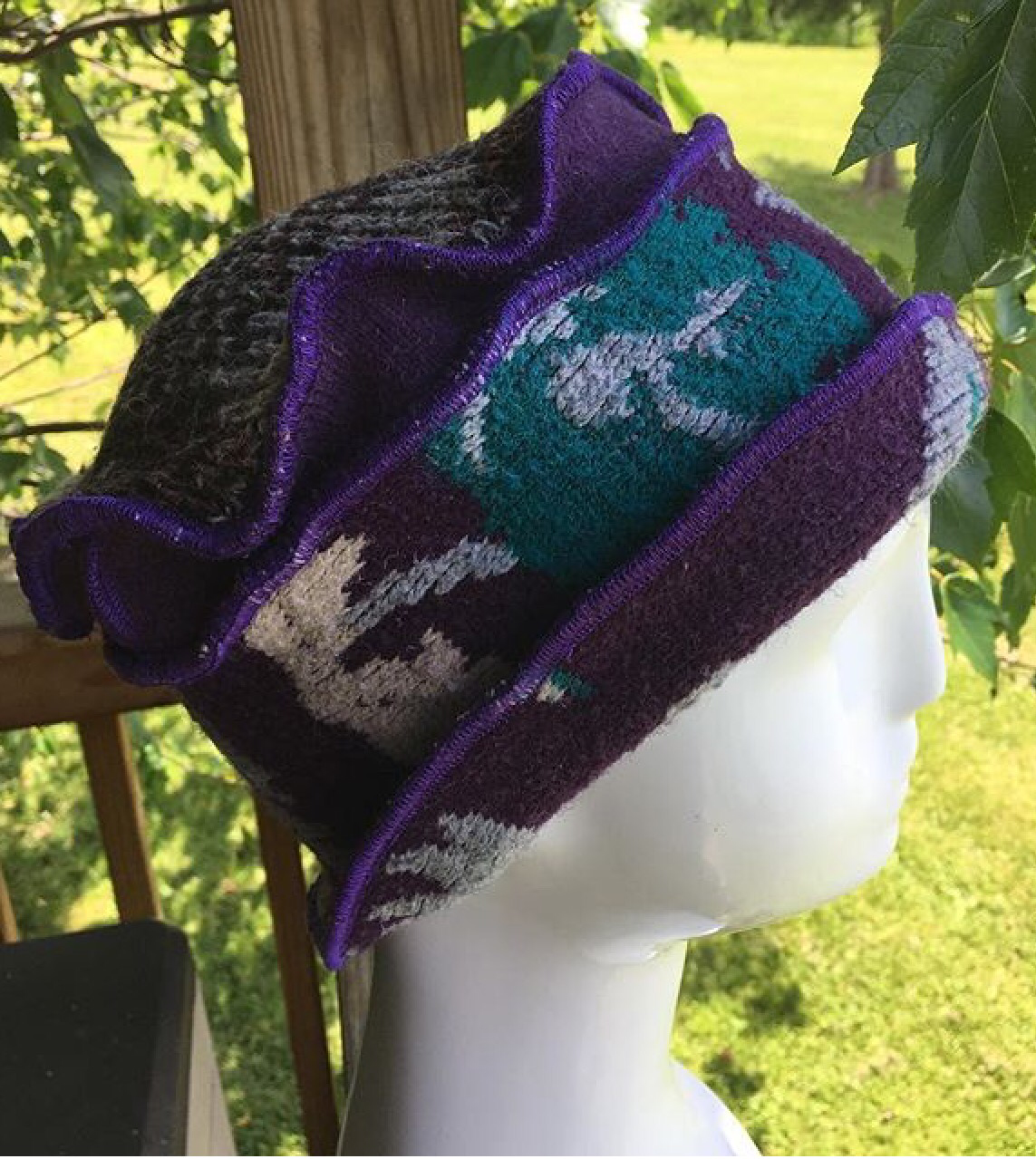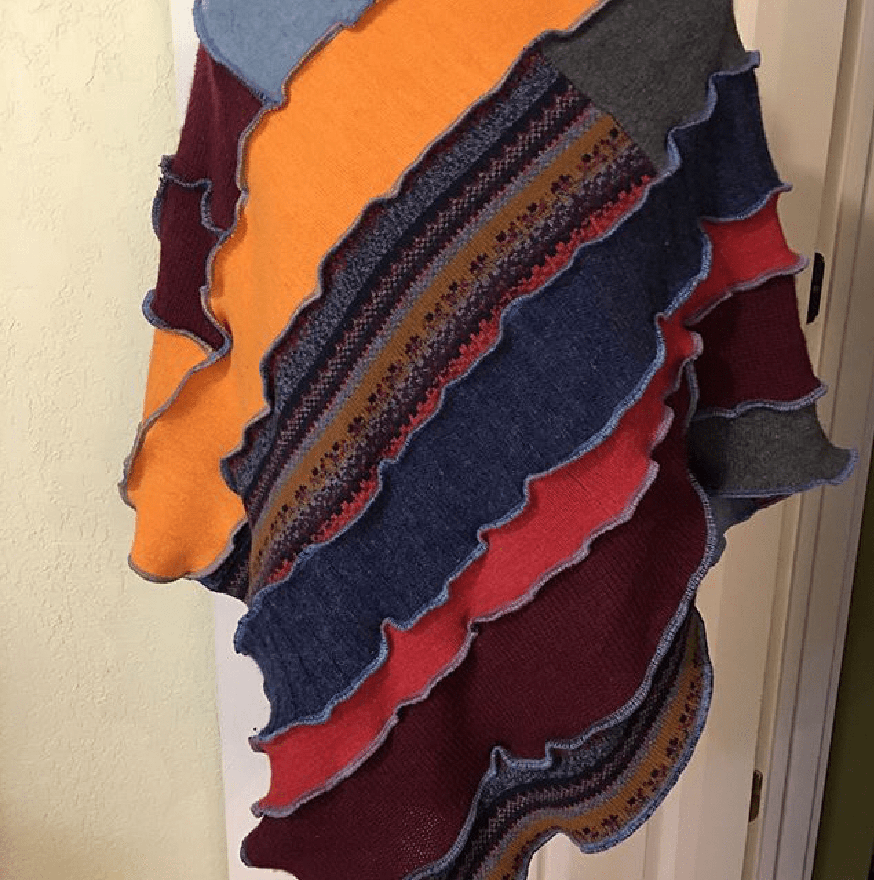 Currently, the Kreationality Etsy shop is fairly empty, because Karen’s stock changes so frequently between summer art shows. If you visit her shop you can see images of her past projects and the customer reviews for them HERE. One of this year’s customer favorites seems to be the poncho. These are pieced together in diagonal strips to add visual interest to each. Don’t you just love the autumn colors in this one?