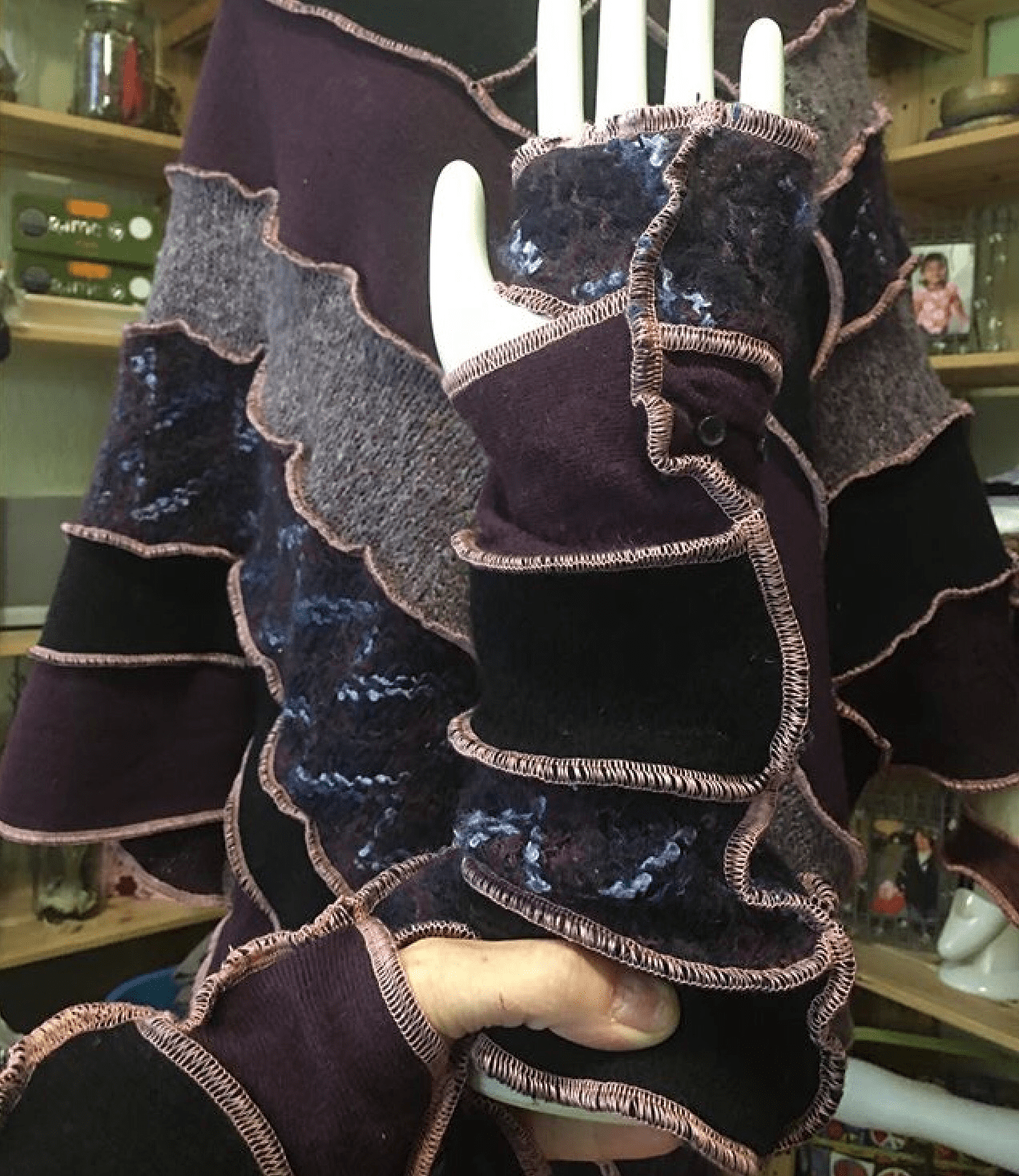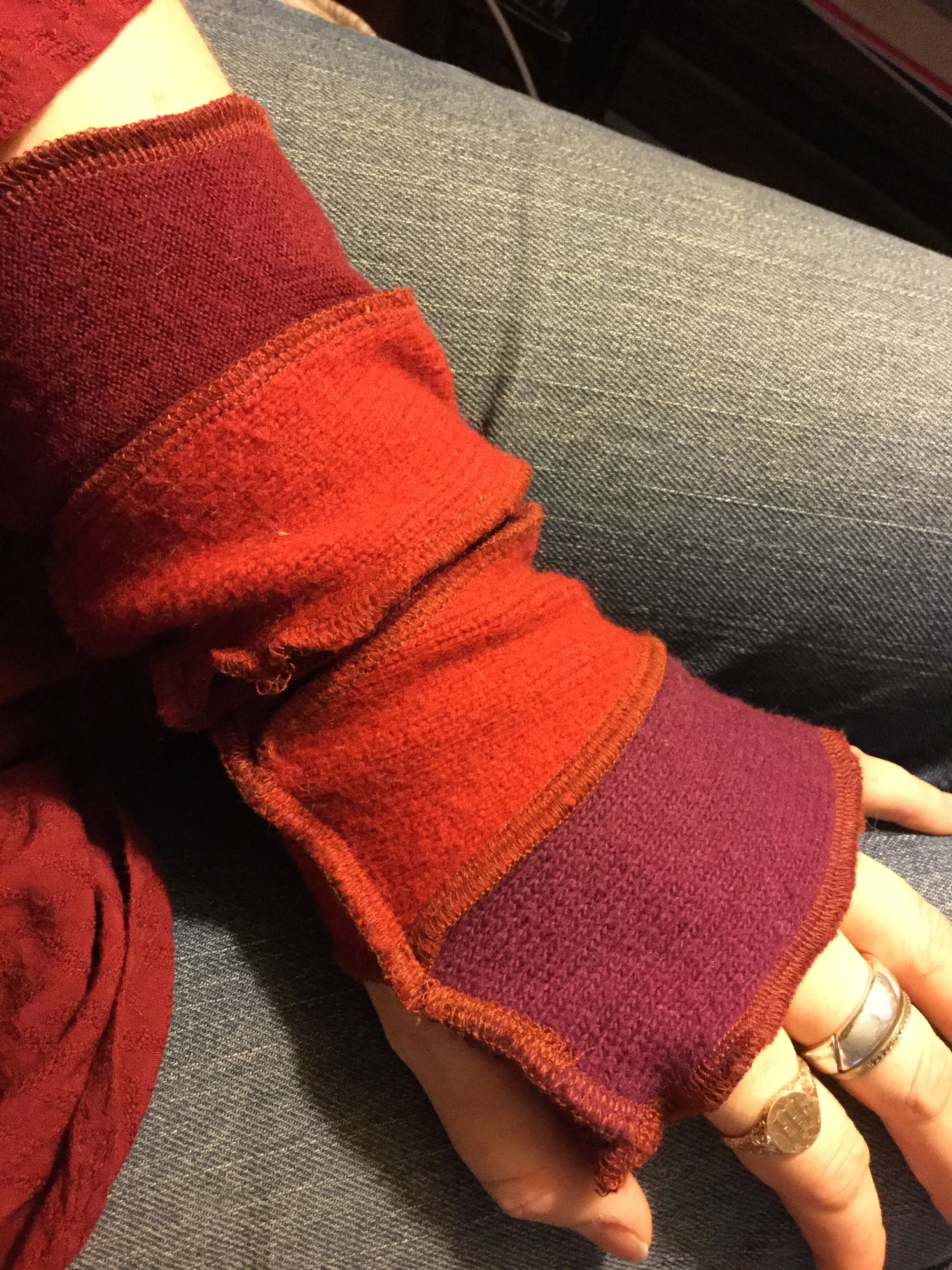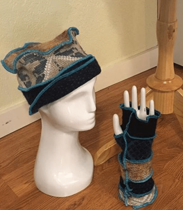 My favorite of all her patterns are what I call mitts; they are fingerless gloves pieced together from 5 or 6 different strips. Sometimes she uses all different coordinating or complimenting sweaters. Sometimes she uses all the same color but different patterns and textures. Sometimes she uses only 1 or 2 that are very similar. They are all beautiful and comfortable, and occasionally they have matching hats!